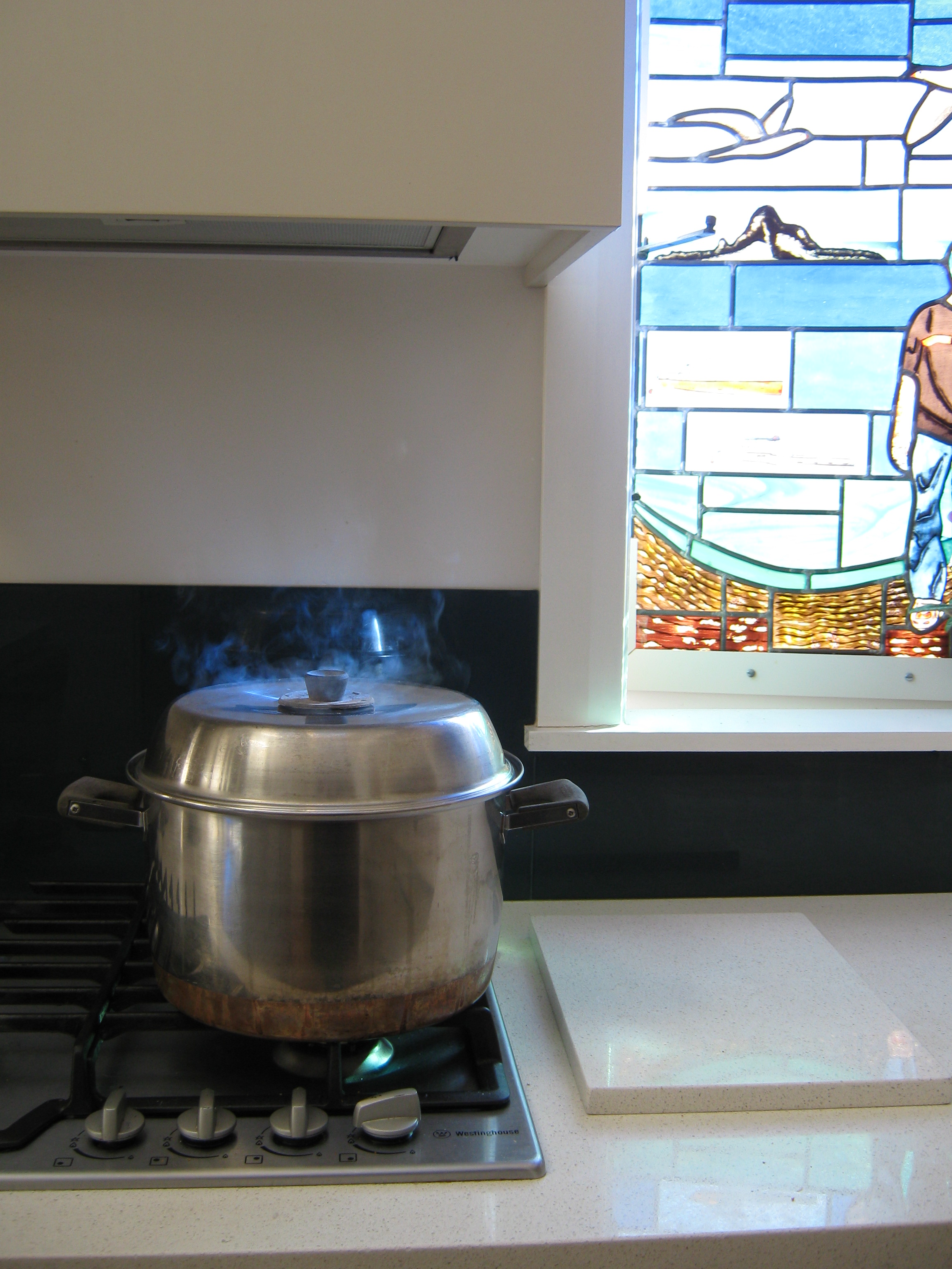 • use the kitchen  extractor fan if you have one, or else open a nearby window -just a crack is usually sufficient.  Make sure the draft from the window doesn’t cause other issues, such as the flame on a gas cook-top going out, or things getting blown towards the cook-top.