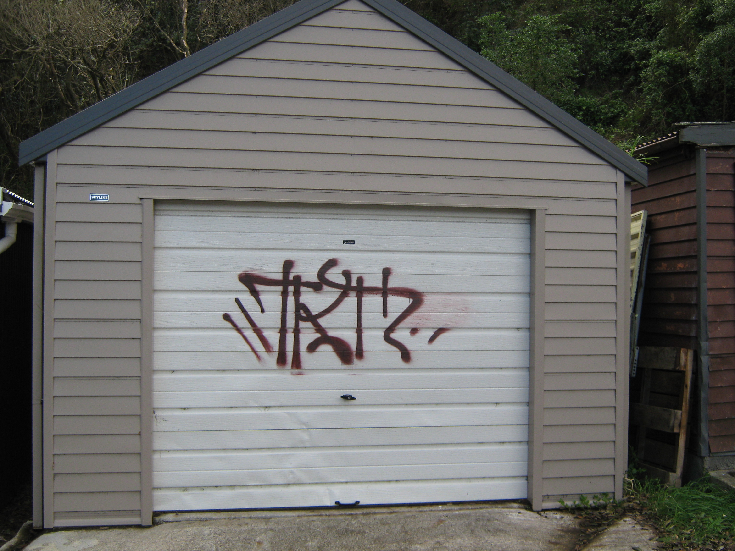 The last few years seem to have seen an increasing problem with tagging- and its really soul-destroying if you are the one whose property is getting regularly targeted. A few weeks ago, four out of the five garages across the road from us were tagged, and now, the only garage that didn’t get tagged then was tagged last night. This time they’ve used a dark red spray paint, which is actually fairly difficult to remove.