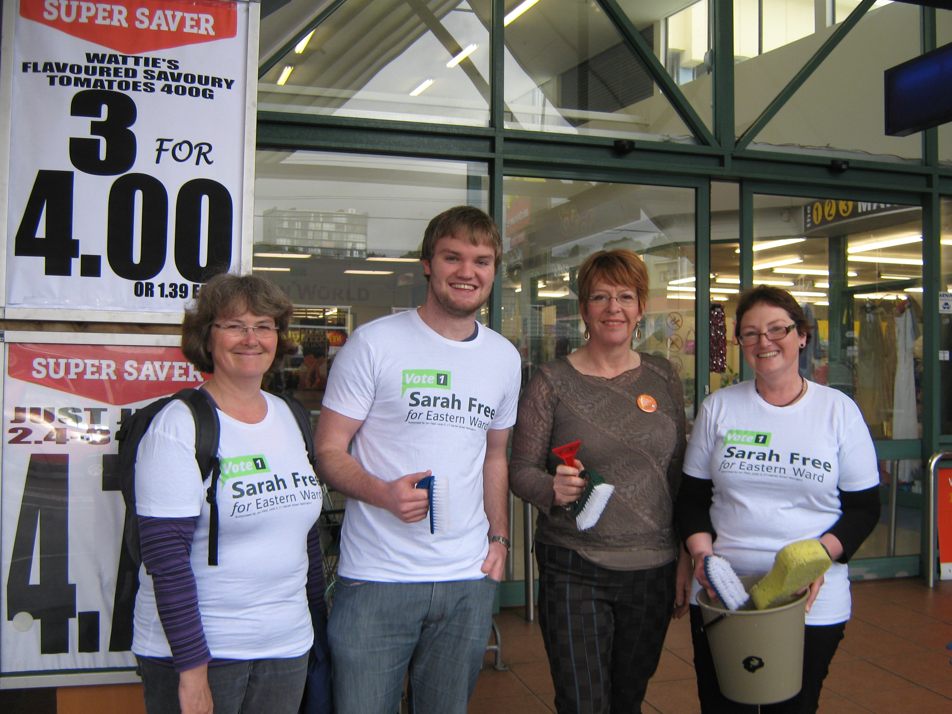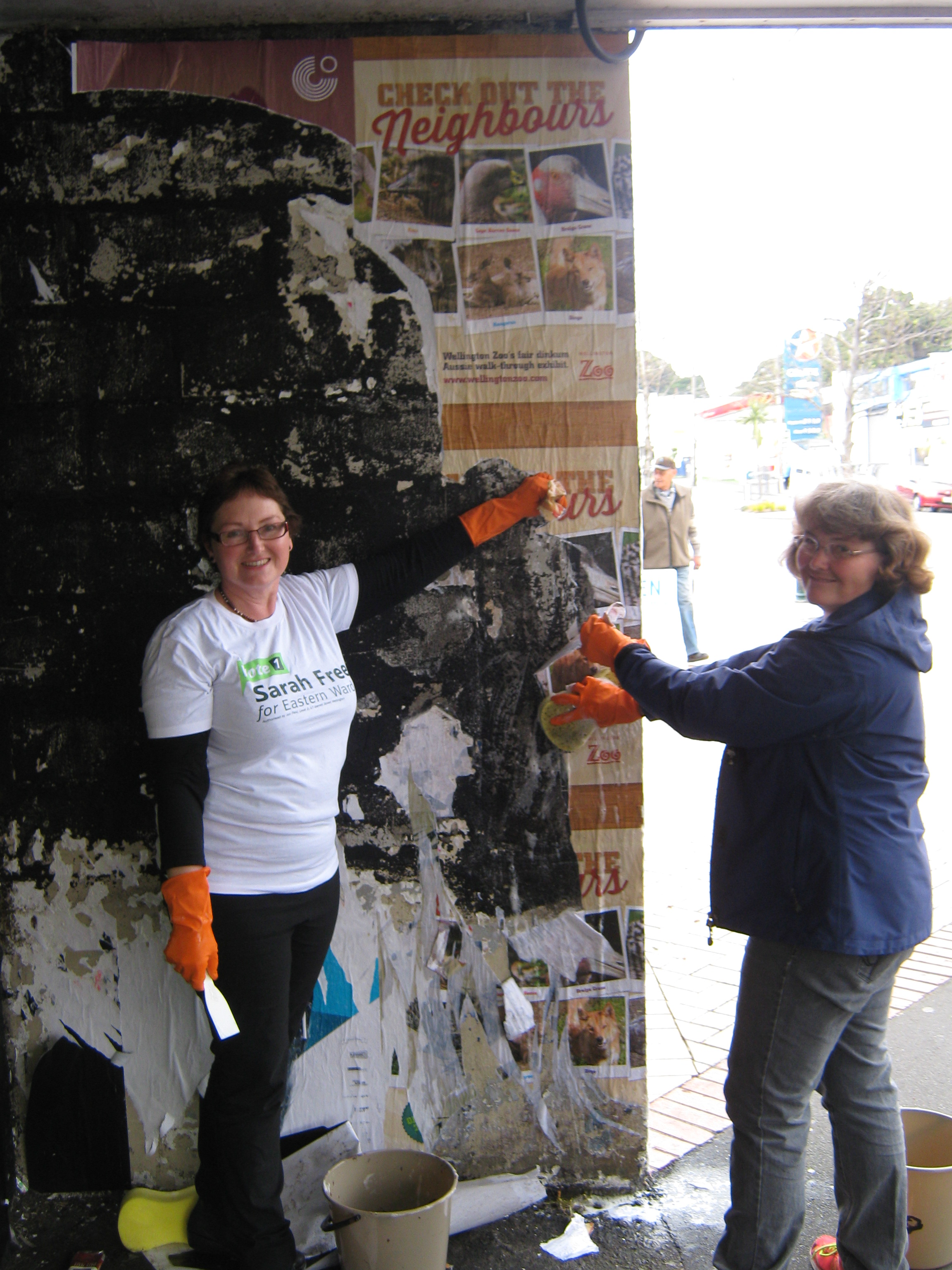 My sister, son and I went along for an hour on Saturday to help out with graffiti removal in Newtown. Mayor Celia Wade-Brown was there too, along with a team of council staff. We were given water, scrubbing brushes and scrapers and were asked to help remove the illegally pasted posters on one of the end walls at the mall.