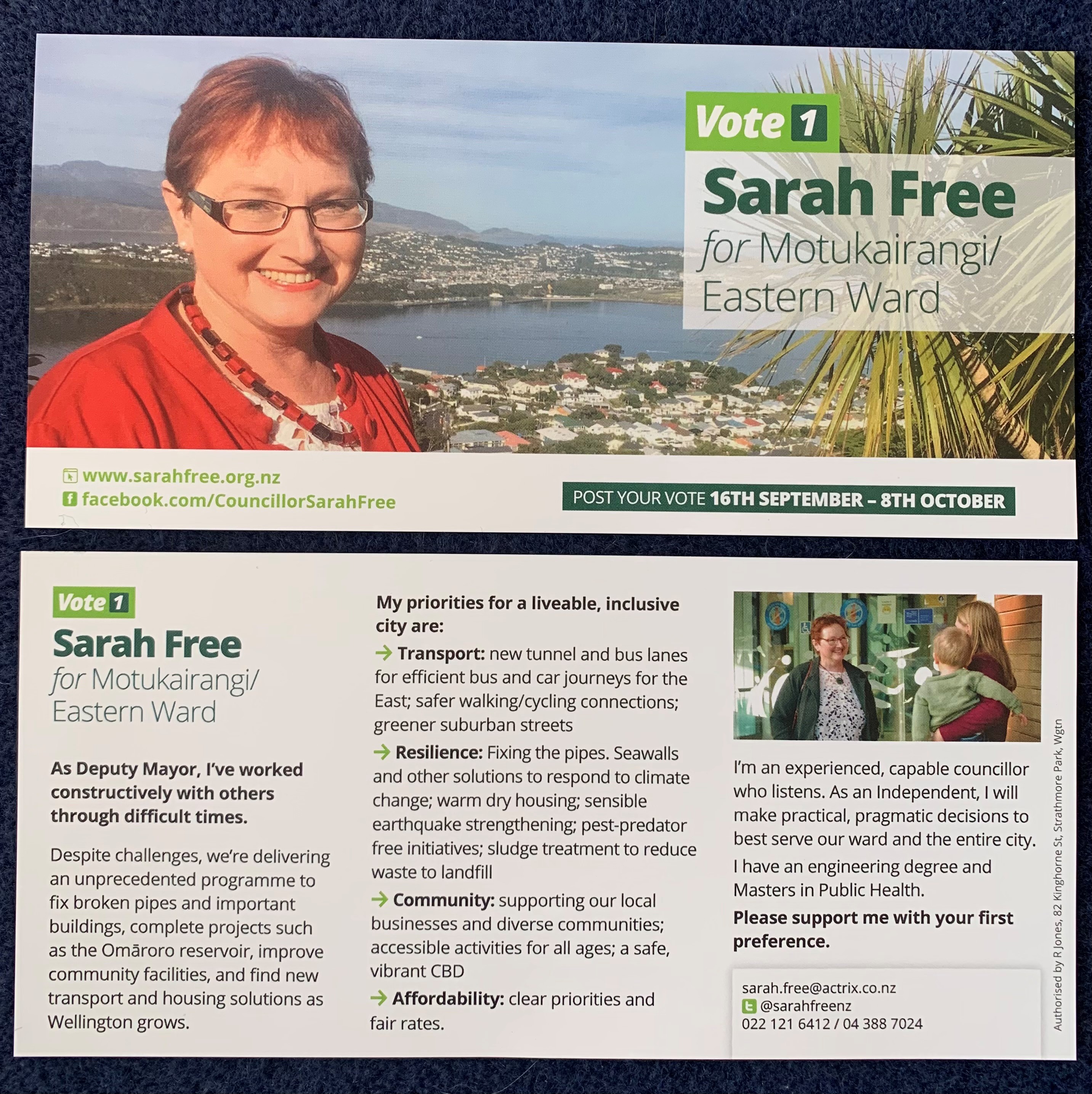The flyer with my priorities is below. As always, super keen to have feedback, and am happy to call or visit residents in the ward. Email sarah.free@actrix.co.nz or call 022 121 6412